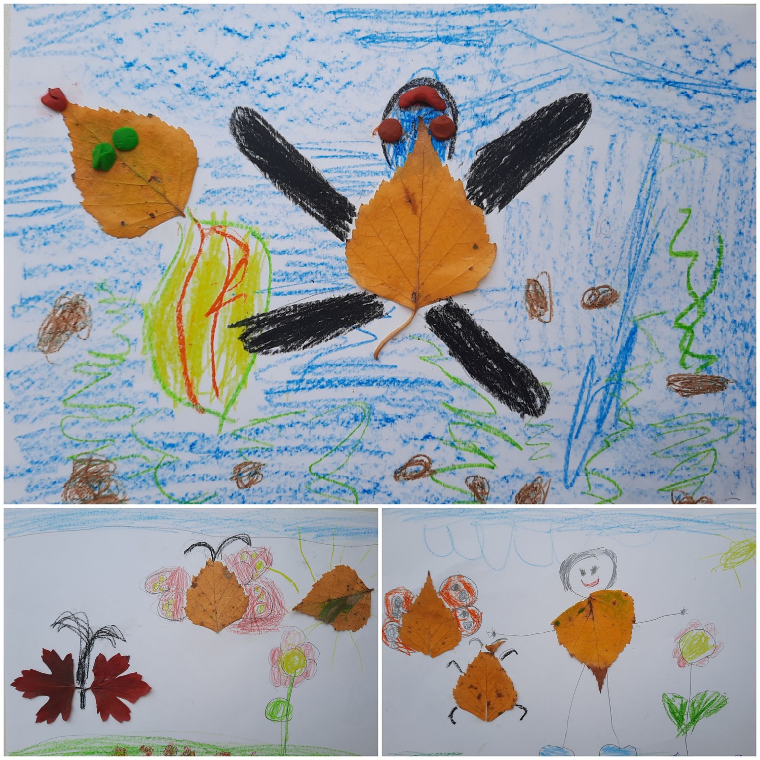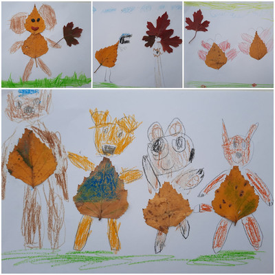 Сказочная осенняя природа - неисчерпаемый источник эстетических чувств и переживаний. Общение с ней обогащает ребёнка, учит наблюдать и замечать красоту, удивляться и радоваться, а сам природный материал является отличным побудителем развития фантазии и воображения. В процессе изготовления аппликации из осенних листьев развивается мелкая моторика руки, восприятие, мышление, внимание, интеллектуальная и творческая активность, что является необходимым условием обучения будущего успешного обучения в школе. На прогулке ребята собрали осенние листочки на нашем участке, рассмотрели на что похож тот или иной лист, что он может изображать, если к нему что-то дорисовать. Вот какие работы у нас получились! Работа с природным материалом не только пополняет знания и трудовые умения ребёнка, но и положительно влияет на формирование основ его личности, правильного отношения к природе и окружающему миру. | |