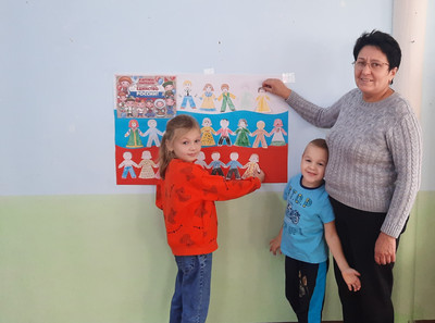 4 ноября вся наша страна отмечает День народного единства. Это праздник, который мы празднуем в память о событиях, которые происходили много-много лет назад. В 1612 году русские воины Кузьма Минин и Дмитрий Пожарский подняли народ на борьбу против врагов, захвативших нашу Родину. Благодаря единству народа в этой нелегкой борьбе, в России наступил мир! А благодарные потомки в честь этой победы воздвигли памятник этим героям. Памятник этот находится на самой главной площади нашей страны – Красной площади. Памятник так и называется: Кузьме Минину и Дмитрию Пожарскому. Как и все страны мира, все государства, существующие на земле, Россия имеет свои флаг и герб. Государственный Флаг России поднимается во время торжественных мероприятий, праздников, и в это время всегда звучит гимн Российской Федерации. Посмотрите, какой плакат у нас получился! В его изготовлении принимали участие ребята и их родители. На флаге три полосы: белая, голубая, красная. Эти цвета символизируют единство мира – земли и неба. Наш флаг называют триколором. Флаг России – триколор, полотнище в три цвета; белый цвет – березка, синий – неба цвет, красная полоска – солнечный рассвет. Взявшись за руки силуэты людей, означают, что "Мы все вместе! Мы едины!" Поздравляем всех с праздником! Счастья,добра,мира!